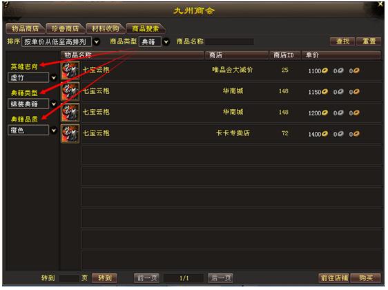 2016年1月28日更新维护后,将恢复典籍搜索功能的正常使用:前往洛阳(329,298)***处,打开九州商会—商品搜索界面时,可对想要查看/购买的典籍进行便捷式搜索。